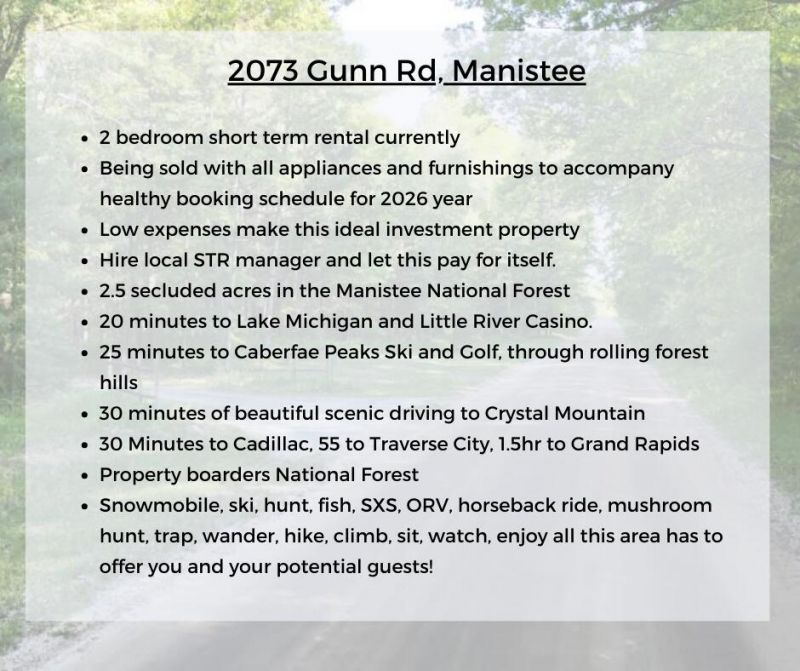 This single family home located at 2073 Gunn Road, Manistee, MI 49660 is currently listed for sale with an asking price of $268,500. This property was built in 2022 and has 2 bedrooms and 1 full baths with 800 sq. ft. Gunn Road is located within the Kaleva-Norman-Dickso school district. Search Manistee real estate on www.karlahummrealtor.com today.
