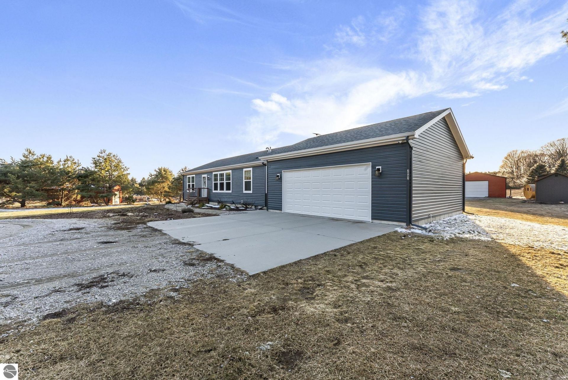 Modern country living on 6.75 acres with multiple outbuildings and outdoor entertaining areas. Built in 2021, this well maintained 3 bedroom, 2 bath home with 2-car attached garage offers the space, privacy, and functionality buyers searching for acreage will appreciate. Inside, the open-concept floor plan connects the kitchen, dining, and living areas, creating a comfortable space for everyday living and entertaining. The split-bedroom layout places two bedrooms on the opposite side of the home from the spacious primary suite, providing privacy for family or guests. The primary bath features a soaking tub and walk-in shower, creating a relaxing retreat. The kitchen boasts a large pantry, newer appliances and an island. Additional features include a laundry/mud room, LED ceiling fans, faux wood blinds throughout, and outside camera security system. Outdoor living is a highlight of this property. A 24x30 deck built in 2024 sits just off the kitchen and includes a 12x20 gazebo with a metal roof, ideal for gatherings, or relaxing evenings. The yard features water-wise landscaping, flower beds that host a variety of birds and wild-life, and a fenced garden area with a 10x16 shed, dual access gates & invisible dog fence. This property offers excellent storage, hobby farm potential, and workshop space with multiple outbuildings including a 24x25 metal barn with cement floor, electricity, wood stove, and remote door opener, a 20x30 metal barn, and two 10x16 Amish-built sheds. Recent upgrades include central air (2024), epoxy garage floor with lifetime warranty (2024), seamless gutters (2022), invisible pet fence, and a Reolink 360 degree smart security system. Located 3 minutes north of everything the North end of Cadillac has to offer, shops, restaurants, grocery stores etc. and 9 minutes to downtown Manton. This home provides ease of living in the country while still being close to everything you could possibly need. Don't delay!