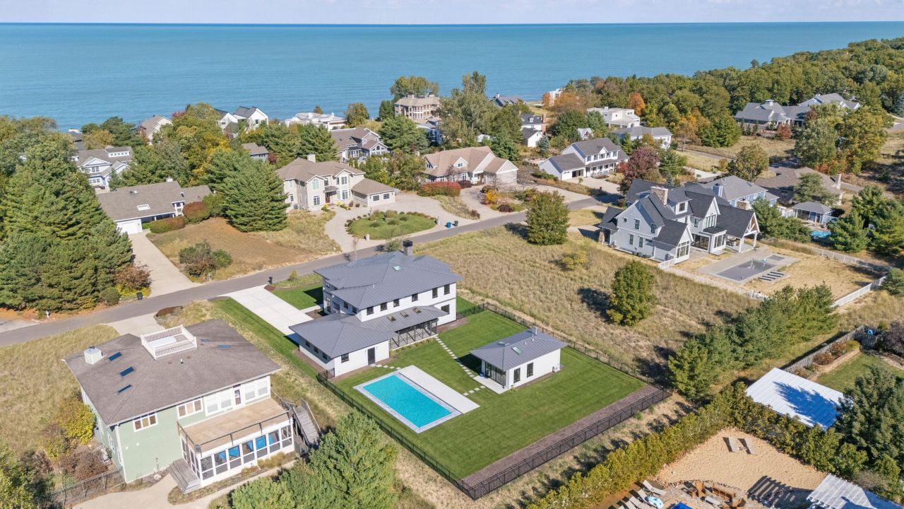 Recently Completed Modern Coastal Retreat in the Village of Grand Beach. This exquisite modern luxury home blends striking architecture, generous living spaces, and resort-style amenities. Set on a half-acre parcel in the coveted Eiffel Tower Bluffs neighborhood, the custom residence showcases a refined modern coastal aesthetic with clean contemporary lines, expansive windows, and a light-filled open floor plan designed for effortless living. Uncompromising quality construction and state-of-the-art household systems are evident throughout. Spanning over 6,000 square feet of finished living space, the home comprises five bedrooms, four full baths, and two half baths, including one located in the stylish pool house. Interiors are defined by relaxed sophistication and comfort with floors of white oak, marble, and limestone. The chefs kitchen features Wood-Mode cabinetry, marble countertops, and a premier appliance suite including Sub-Zero, Wolf, and Bosch. A generous hidden pantry enhances functionality with a wine cooler and a secondary laundry center. Outdoors, the property becomes a private oasis with a Caribbean saltwater pool accented by marble coping, a safer 4-6 depth profile, and an automated safety cover. Additional highlights include a two-car garage with bonus storage and workshop space, plus room for a golf cart. Designed for year-round comfort and efficiency, the home is equipped with Marvin windows, 12-zone radiant heat serving the basement, main level, upper level, and garage. Cooling is provided by Carrier systems, while the pool house is conditioned by a Mitsubishi ductless system. A Generac 20kW whole-house generator ensures uninterrupted power. Ideally located just a short golf cart ride to exceptional Grand Beach community beaches, as well as golf, tennis, and a playground.